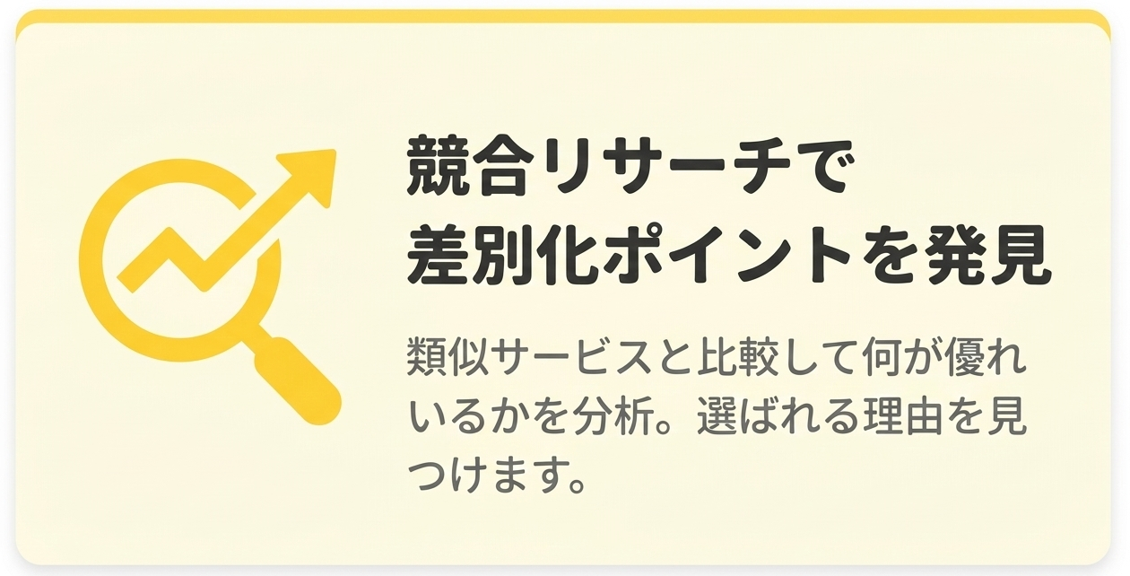 競合サービスを分析し、あなたのサービスの優位性を明確にします。これにより、「なぜあなたから購入すべきか」が伝わる、他のサービスとの違いを打ち出せるポイントを見つけ出します。